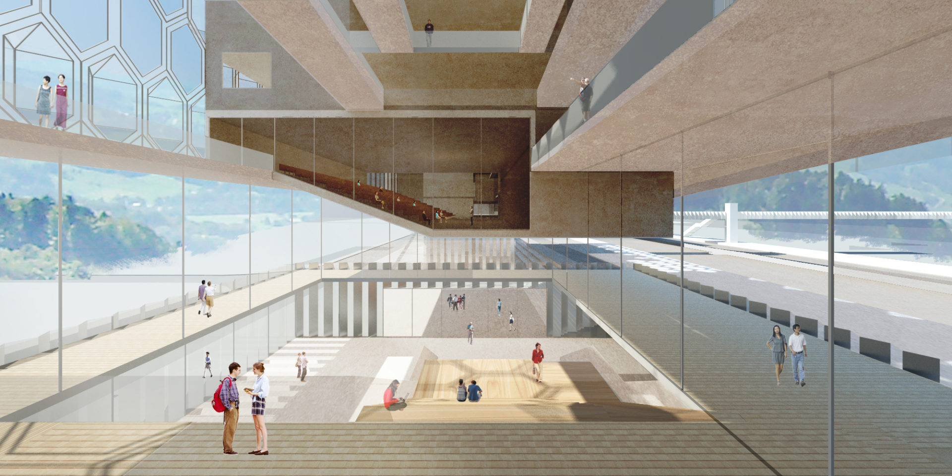 The adopted formal approach features a sleek, linear design, contrasting and complementing the iconic verticality of the neighboring Industrie 17 tower. The layout of the project emphasizes the site’s linearity by proposing a compact, fluid building that effectively addresses the elevation differences between the northern and southern parts of the site. A large, through forecourt, located between Rue de l’Industrie and Rue des Entrepôts, opens up toward Route des Portes Neuves. This design enhances the site’s permeability, facilitating pedestrian movement from the southern to the northern part of the campus. The site, proposed by the city of Sion for the new campus, acts as an urban interface: between the northern and southern parts of the city, between the old town and the newer developments, and between the railway lines and the river.
